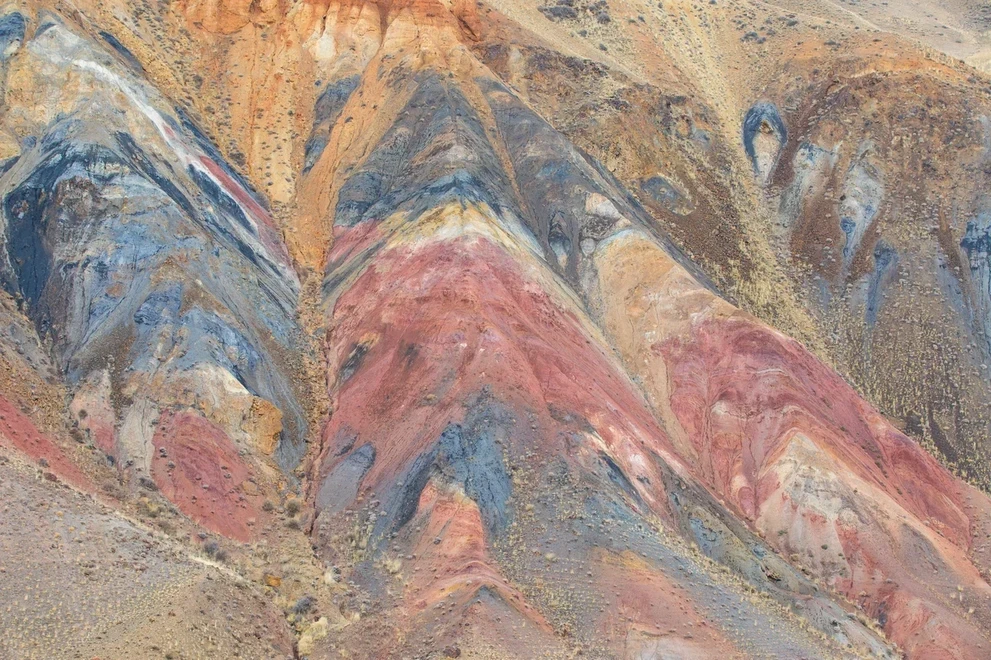 разноцветные слои горных пород: красные, оранжевые, жёлтые и зелёные оттенки;