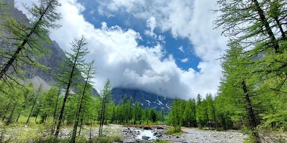 Погуляв по территории гномов, переходим реку по мостику и по комфортнейшей лесной тропе идем в долину реки Актру. Каждый день мы будем видеть кедры, лиственницы и наслаждаться красотой цветущих лугов, представляете как здорово!