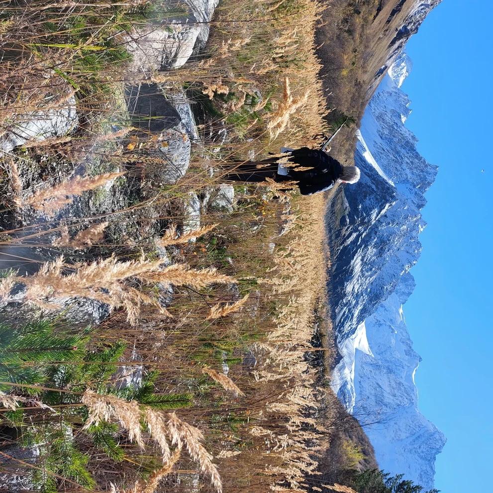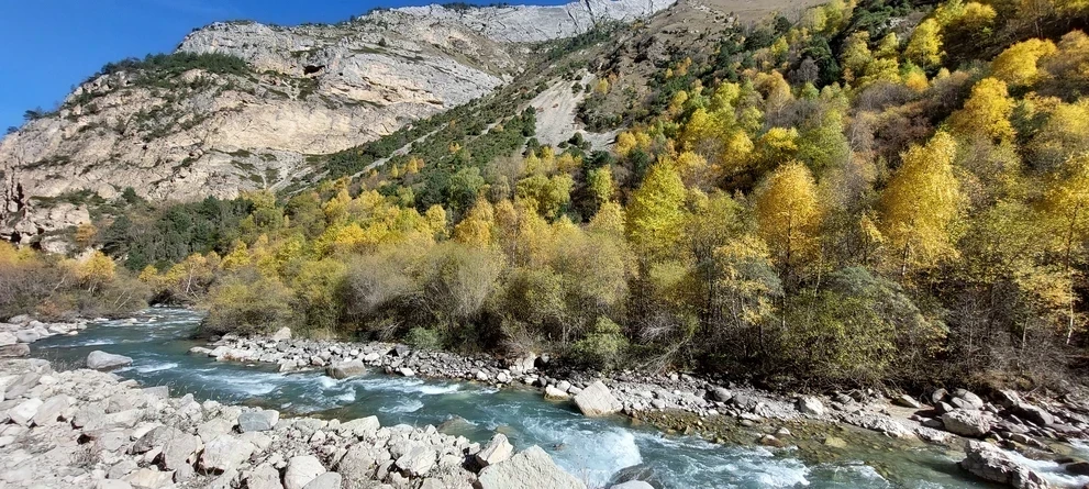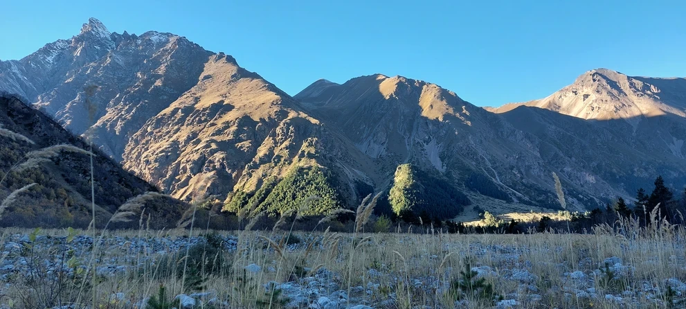Идем сразу к леднику! Тропинка еще немного пройдет по тенистому лесу, а затем выведет на огромную, роскошную поляну, которую по осени украшает целое море колосков. Далее пойдем вдоль реки, и с каждый шагом будем приближаться к снежным горам, которые стоят в конце ущелья.