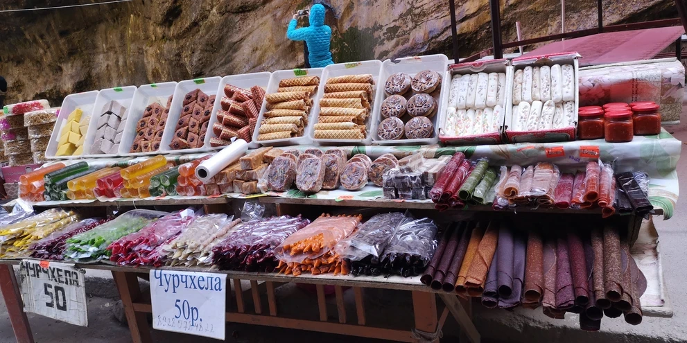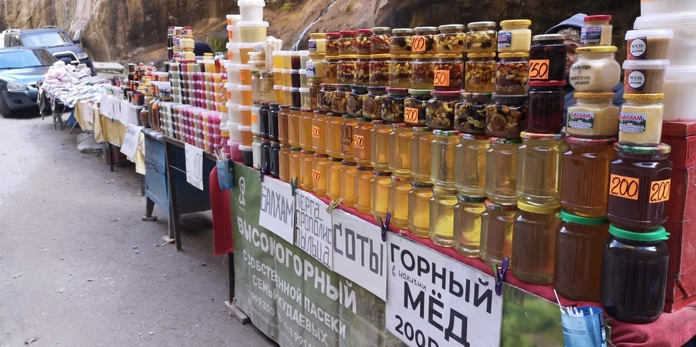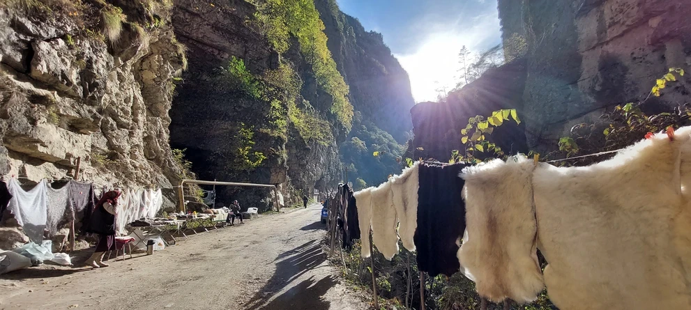 В этом же ущелье будет сувенирный рынок. Здесь ваша туристическая душа сможем себя побаловать магнитиками, горными чаями, теплыми носками, шалями, браслетиками… Одним словом, здесь инструктор надолго потеряет туристов)))
