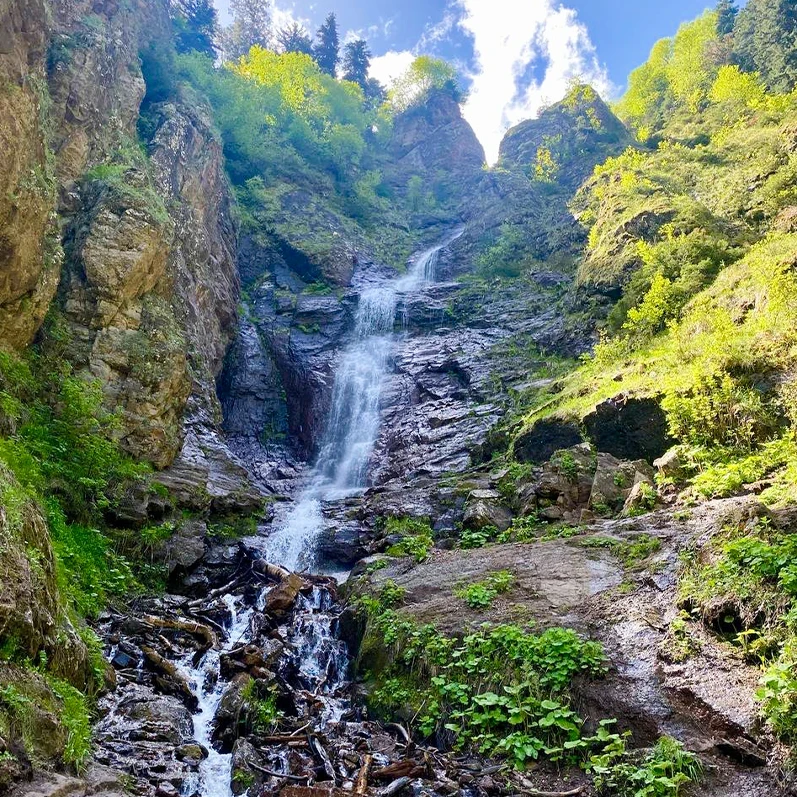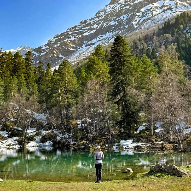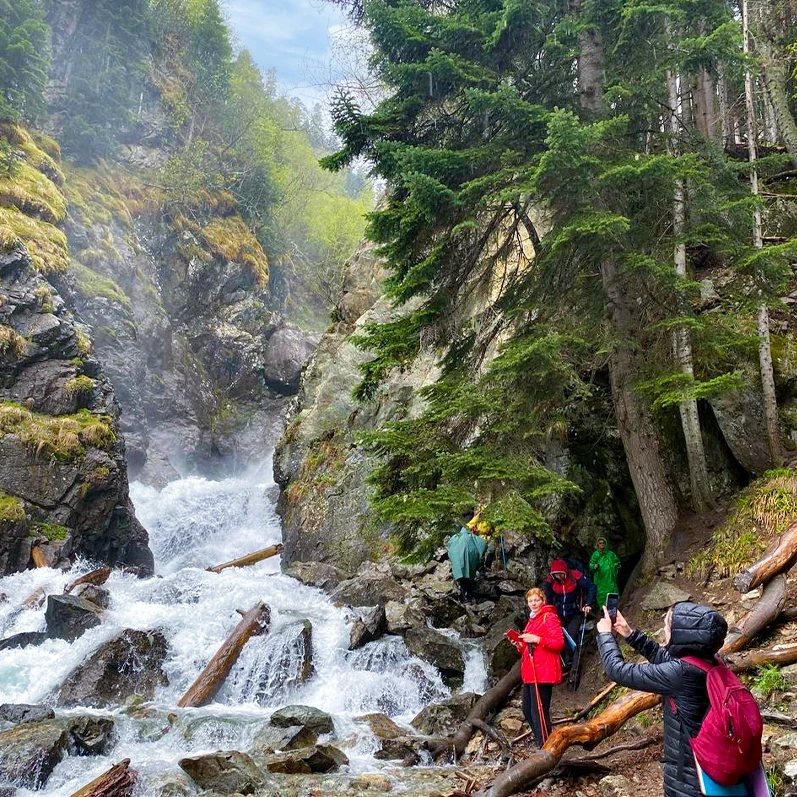 К поляне Таулу немного подъедем на авто, а далее пойдем пешком! С каждым изгибом дороги хребты Архыза вырастают у нас словно на глазах. За очередным поворотом увидим главную гору этих мест – снежный Пшиш. Дорога к водопаду ровная, удобная для ходьбы, набор высоты минимальный, так что устать не получится))). В мае на полянках по пути обязательно увидим и сфографируем первые, горные цветы.