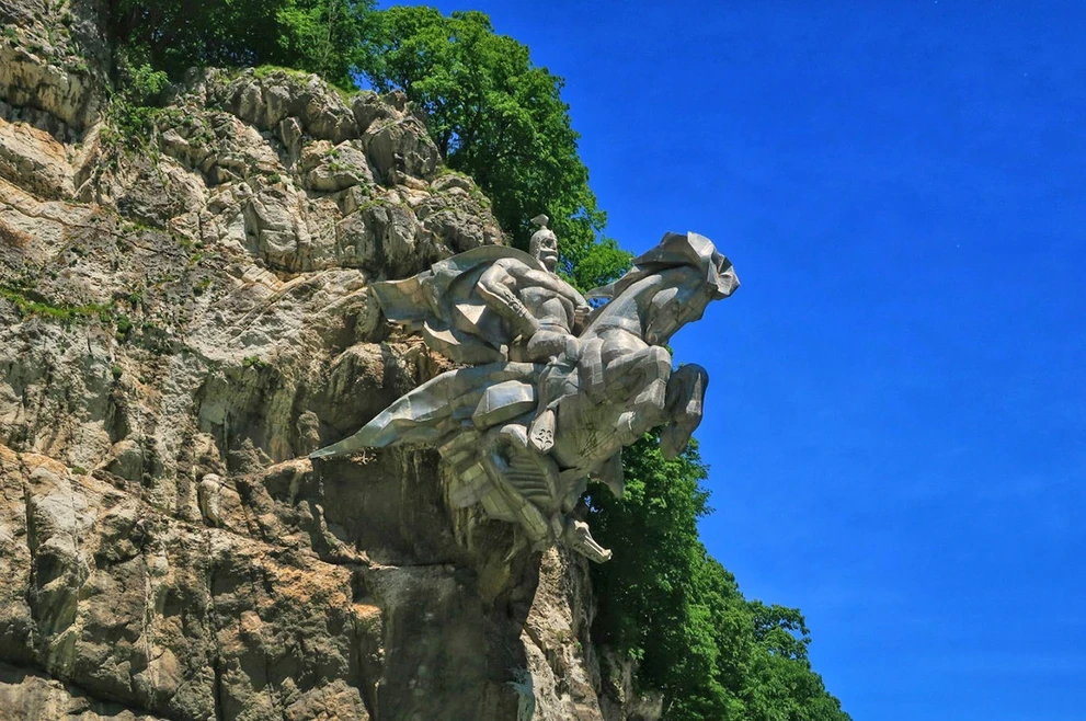 Далее в Алагирском ущелье увидим один из самых эффектных монументов Осетии – летящего на коне Уастырджи. Он является покровителем мужчин, воинов и путешественников. Огромный, эффектный всадник на стальном коне словно пронзает насквозь скалу и вылетает на дорогу. Вес этой скульптуры – 28 тонн!! Это самый высокий конный монумент в мире!