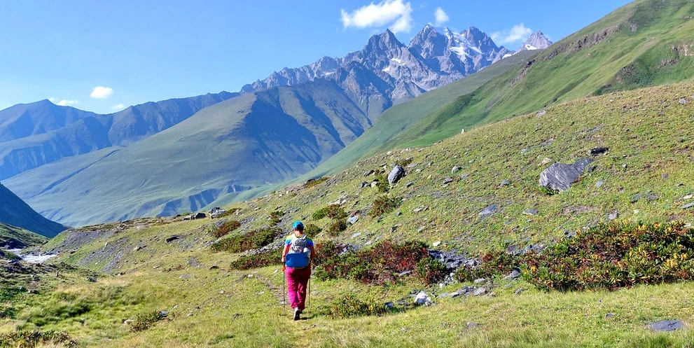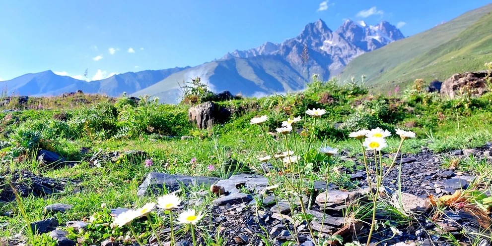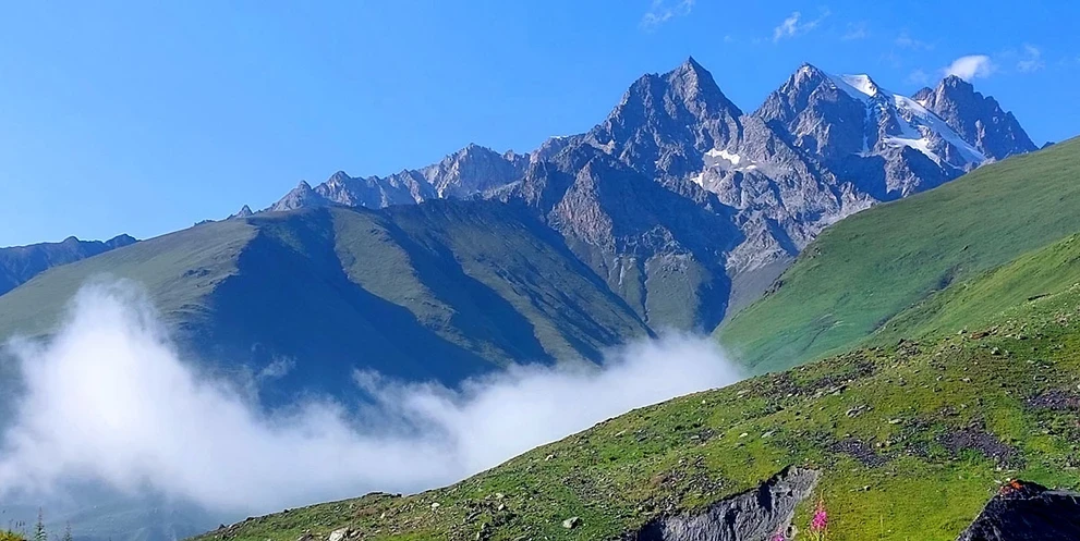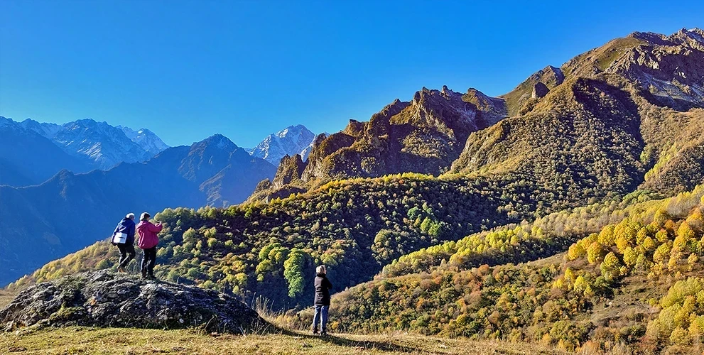 На машине повышенной проходимости сегодня едем поближе к Главному Кавказскому хребту, чтобы полюбоваться на снежные вершины и совершить треккинг к леднику Уштулу.