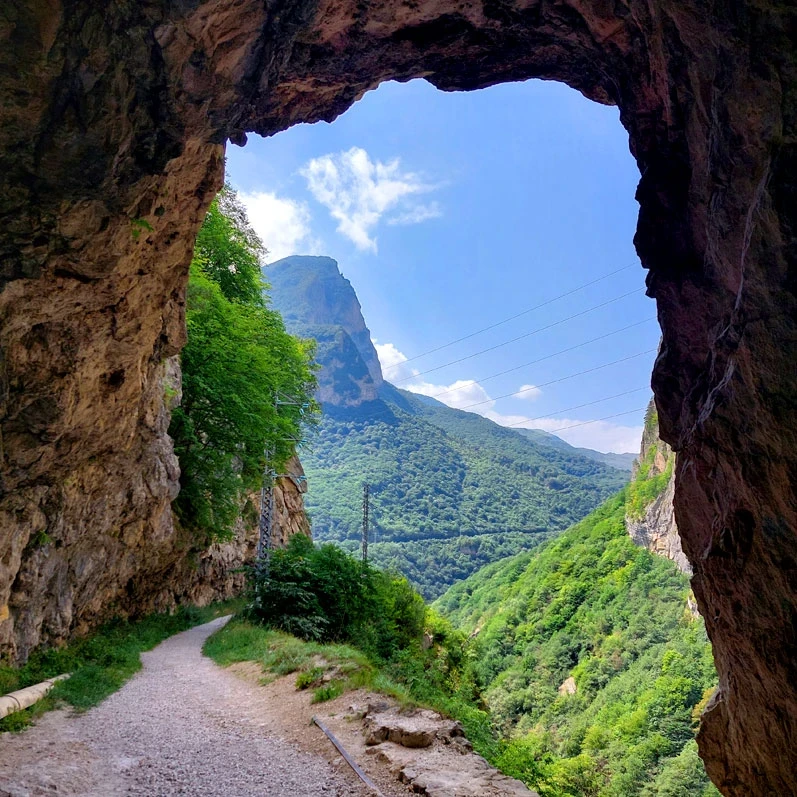 По пути сделаем остановку в очень эффектном месте – на Черекской теснине! Автомобили здесь проезжают по горному туннелю, а мы прогуляемся по старой дороге, которая ведет вдоль глубокого горного ущелья. Здесь же можно будет приобрести вкусные и полезные кавказские сувенирчики ;).